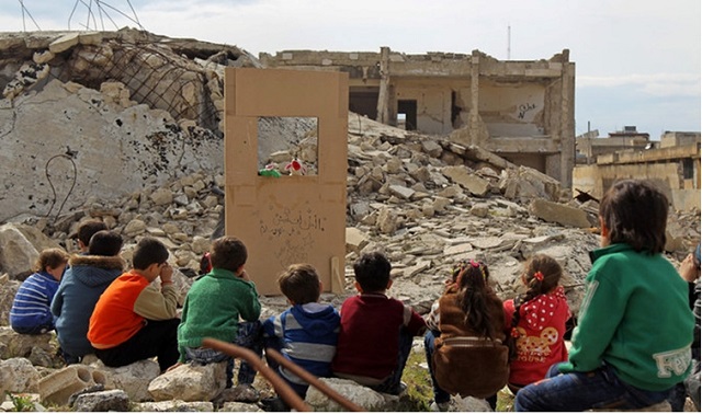 Suriye’nin isyancıların kontrolünde olan İdlib eyaletinde çocuklar, yıkılmış binaların ortasında, Suriyeli bir aktör tarafından icra edilen kukla gösterisini izlerken. Kaynak: AFP