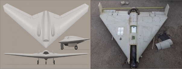 TERSİNE MÜHENDİSLİK ESERİ OLABİLİR Mİ? – Solda ABD Lockheed Martin firması tarafından geliştirilen ve 04 Kasım 2011 tarihinde İranlı uzmanlar tarafından ele geçirilerek İran topraklarına indirilen RQ-170 Sentinel, sağda ise Shahed Aviation Industries Research Center tarafından geliştirilen Shahed-136 modeli kamikaze dron görülmektedir.