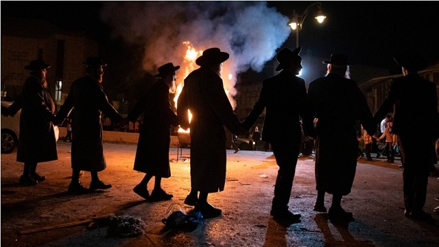 Aşırı Ortodoks Yahudiler, Kudüs kentinde; Roma devrinde Yahudilerin yok edilmelerinin sonunu kutlamak maksadıyla Lag Ba’Omer dinsel festivalinde ateşin etrafında dans ederken görülmektedir. 29 Nisan 2021. Fotoğraf: Sebastian Scheiner/AP Photo.