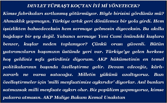 Kâr edeni de satacağız, zarar edeni de satacağız. Devleti ekonomik faaliyetlerden kurtarıncaya kadar satacağız. Pamuk eller cebe. Yerli yabancı herkes gelsin. AKP Maliye Bakanı Kemal Unakıtan