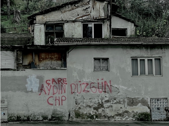 ‘‘Beykoz Üzgün Çare Aydın Düzgün, CHP’’ konulu iletişim çalışması. ‘‘Beykoz Üzgün’’ kısmı, aksini düşünen bir Beykozlu tarafından boyanmış, 21 Aralık 2023, Beykoz-İstanbul. Fotoğraf: Ercan Caner, Sun Savunma Net