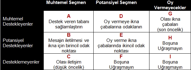 A – Oy verme olasılığı en yüksek olan ve sizi destekleme olasılığı en yüksek olan kişiler, destek tabanınızdır. Öncelikle bu desteği sağlamlaştıracak faaliyetler planlayın.
