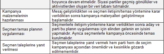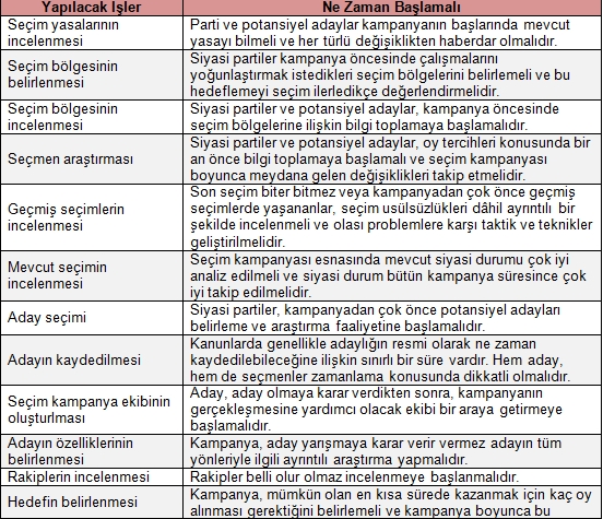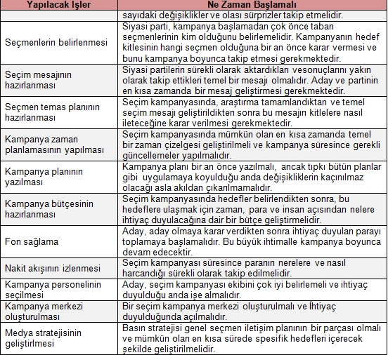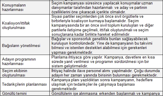 Aşağıda sunulan seçim kampanya planı hazırlanmalı ve uygulanmalıdır. Bu tablo ana seçim kampanya esaslarını ve ne zaman uygulanmaya başlanacağını göstermektedir. Ülke, parti programı, ilkeler, mevcut siyasi durum ve diğer faktörler dikkate alınarak ilave hususlar ilave edilebilir.