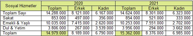 Sosyal hizmetlerden faydalananların 2020 ve 2021 yıllarındaki miktarı.