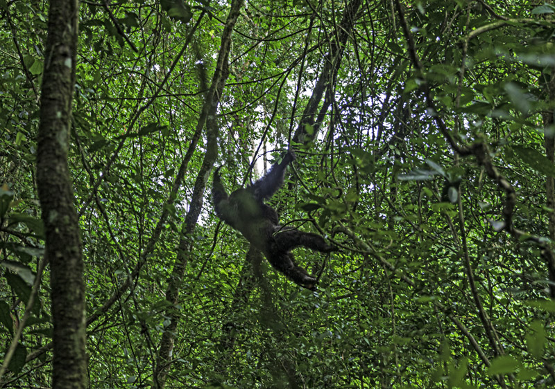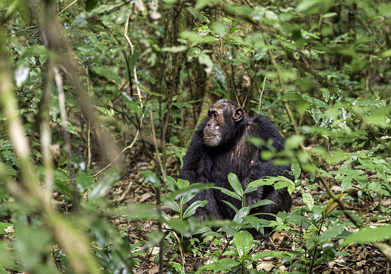 Sonunda ormanın derinliklerinden gelen sesi duyduk. O tarafa doğru yönelen rehberimizi takibe başladık. Biz yaklaştıkça ses gittikçe artıyordu. En yüksek noktaya çıktığı yer şempanzelerin bulunduğu yer.