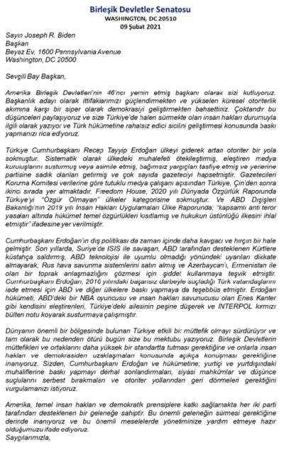 Amerika Birleşik Devletlerinin 50 eyaletinden seçilen iki senatör olmak üzere toplam 100 üyesi olan ABD Senatosu, ABD’nin 46’ncı Başkanı Joe Biden’e, altında her iki partiden toplam 54 senatörün imzası olan Türkiye ile ilgili bir mektup yazmıştır. Mektubun orijinali Türkçeye çevrilerek, yorumsuz olarak okuyuculara sunulmuştur.