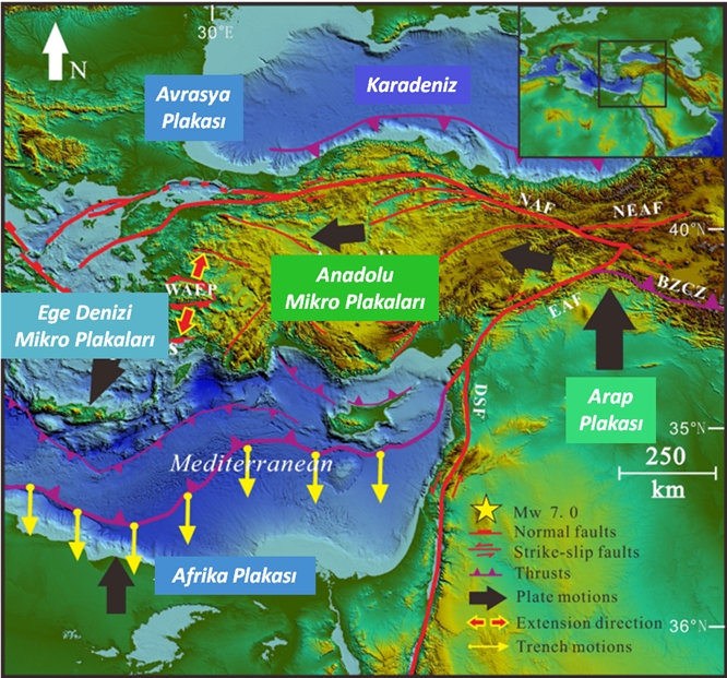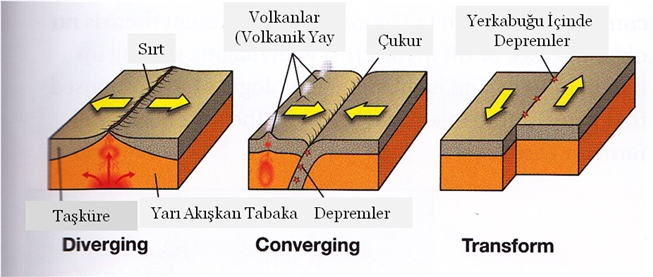 Türkiye, üç ana tektonik plaka arasında yer almaktadır. Bu plakalar; Avrasya, Afrika ve Arap pakalarıdır. Arap plakası yılda yaklaşık 1.7 cm. Anadolu’yu kuzeye doğru itmektedir. Plakalar ve fay hatları. Divergent-Ayrılma, Convergence-Yaklaşma, Transform.