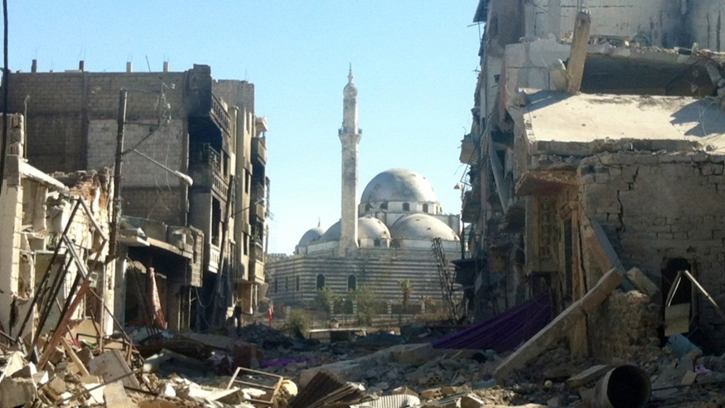 Khalid bin Walid Camii önünde hasar görmüş binalar, Humus, Suriye, Temmuz 2013. Fotoğraf: Sam Skaine, Getty.