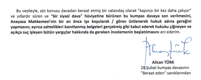 Bu vesileyle, söz konusu davadan beraat etmiş bir vatandaş olarak “kapınızı bir kez daha çalıyor” ve yıllardır süren ve “bir siyasî dava” hüviyetine bürünen bu kumpas davaya son verilmesini, Anayasa Mahkemesi’nin bir an önce işe koşularak / görev üstlenerek hukuk adına gereğini yapmasını; ayrıca sahtelikleri kanıtlanmış belgeleri gerçekmiş gibi kabul ederek hukuku çiğneyen ve açıkça suç işleyen bütün yargıçlar hakkında da gereken incelemenin başlatılmasını arz ederim.