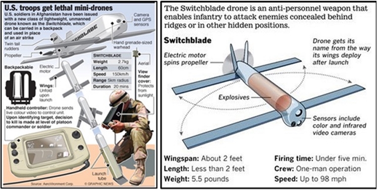 ABD Ordusu, Afganistan’da kullanmak üzere ‘‘SwitchBlade’’ isimli ölümcül mini dronları envanterine katmıştır. Sırt çantasında taşınabilecek büyüklükteki bu havada dolanan katil mühimmatlar, sırtların gerisinde veya diğer yerlerde gizlenen düşman personeline karşı geliştirilmiştir.