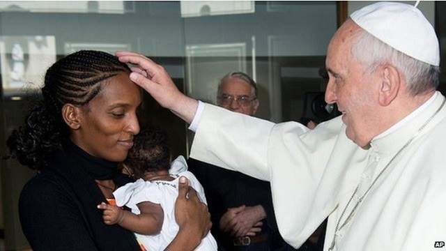 Din değiştiren Sudanlı Meriam Yahia Ibrahim Vatikan’da Papa Francis tarafından başı okşanırken görülmektedir. 24 Temmuz 2014. Kaynak: BBC
