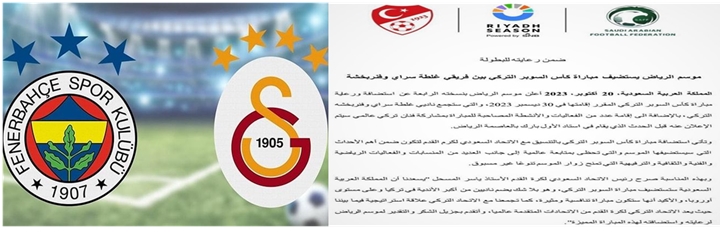 2022-2023 Sezonu Süper Lig Şampiyonu Galatasaray ile Ziraat Türkiye Kupası Şampiyonu Fenerbahçe arasındaki 2023 Turkcell Süper Kupa maçı kulüplerimizin bilgisi dâhilinde, 30 Aralık 2023 Cumartesi günü saat 20.00’de Suudi Arabistan’ın başkenti Riyad’da bulunan Al-Awwal Park (Kral Suud Üniversitesi) Stadyumu’nda oynanacaktır. Kamuoyuna saygıyla duyurulur. Türkiye Futbol Federasyonu