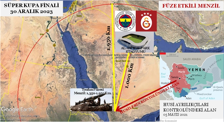 Yukarıdaki haritada da görüldüğü gibi, Yemenli Husilerin elinde bulunan Toufani füzesinin etkili menzili 1,350 – 1,950 kilometredir. Fenerbahçe ile Galatasaray futbol takımları arasındaki maçın oynanacağı Al-Awwal Park stadının Husi kontrolündeki topraklara olan uzaklığı ise sadece 1,000 kilometre civarındadır.