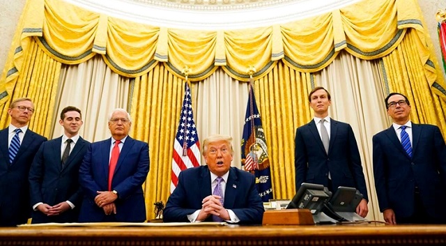 ABD Başkanı Donald Trump, İsrail-BAE barış anlaşması hakkında Beyaz Ev Oval Ofiste konuşma yaparken. Kaynak: AP