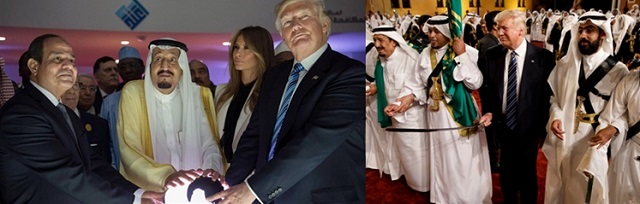 Solda; başkan seçildikten sonra ilk yurt dışı ziyaretini Suudi Arabistan’a yapan Donald Trump’ın, yanında Vatikan ziyaretinde başını kapatan eşi, Suudi kralı ve Mısır devlet başkanıyla verdiği ilginç poz. Sağda ise Suudilerle kılıç dansı yapan ABD başkanı görülmektedir. Kaynak: EPA