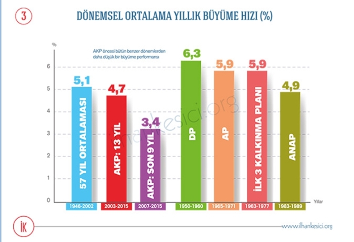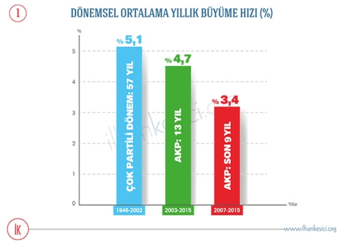 İki: O andan itibaren, 2007’den itibaren, Cumhurbaşkanından itibaren bütün Türk devleti neredeyse AK PARTİ’nin elinde olmuştur. Yani Cumhurbaşkanı AK PARTİ, Başbakan AK PARTİ, Meclis Başkanı AK PARTİ, arkamızdaki Bakanlar Kurulu AK PARTİ, Meclisin çoğunluğu AK PARTİ, neredeyse bütün büyükşehir belediye başkanlıkları vesaire AK PARTİ, tam süzme bal AK PARTİ dönemi denilebilir. Bu on yılın ortalama her yıl üst üste büyüme hızı yüzde 3,3.