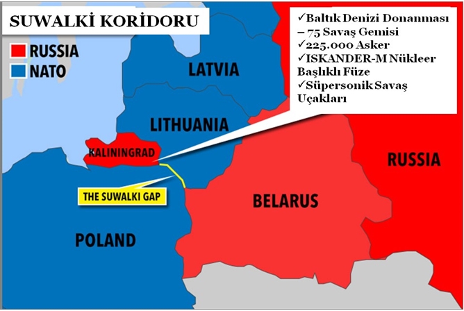 Suwalki Koridoru, Polonya ile Litvanya arasında uzanan dar bir arazi şerididir. Rusya ve en yakın müttefiki Beyaz Rusya’nın (Belarus Cumhuriyeti) burayı başarılı bir şekilde işgal edip kapatması durumunda, Baltık NATO üçlüsü Litvanya, Letonya ve Estonya’nın güneydeki müttefikleriyle bağlantısı kesilecektir.