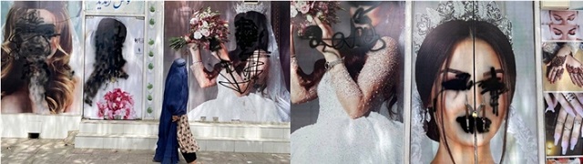 Taliban terör devletinin Kabil’de kontrolü ele geçirdiği gün güzellik salonlarında kadınları gelinlikle gösteren reklam afişleri boyanmış ve kentteki bütün güzellik salonları kapatılmıştır.