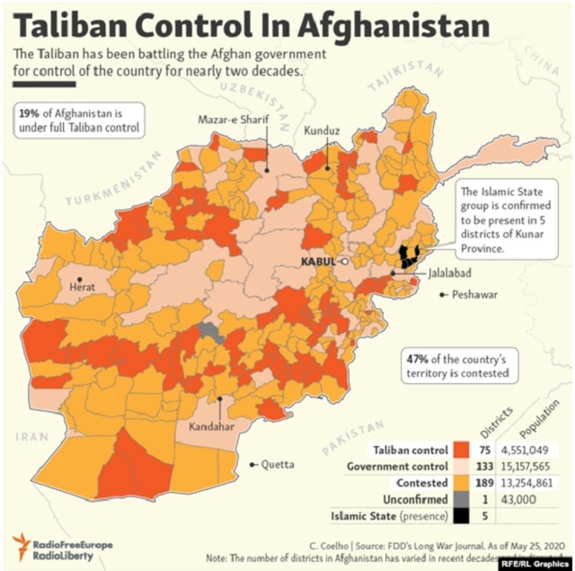 Bilindiği gibi ABD 11 Eylül 2021 tarihine kadar Afganistan’dan çekilmeyi tamamlamayı hedeflemektedir ve çekilmenin başladığı Mayıs ayından günümüze kadar geçen sürede Taliban militanları 40 bölgede kontrolü ele geçirmiş durumdadır.