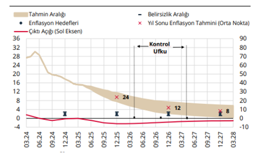 TCMB’nin bugün yayımlananı Enflasyon Raporuna göre 2025 yılsonu enflasyon tahmini %24 olarak korunurken, tahmin aralığı da ±5 puan aralığında sabit tutulmuştur.