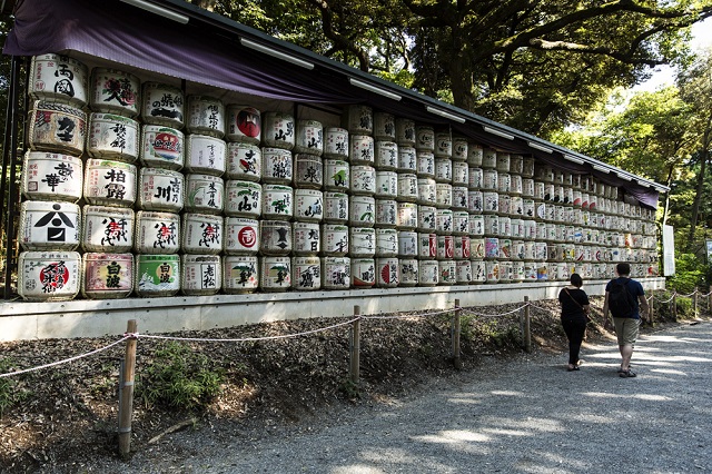 Çakıl taşlı yolda yürürken sağlı sollu istif edilmiş fıçılar hemen dikkat çekiyor. Üzerlerinde Japon alfabesi ile yazılmış yazılar var. Ancak görünüşleri çok güzel. Sorduğumuzda sağ taraftakilerin sake, sol taraftakilerin de şarap fıçıları olduğunu öğreniyorum. Bunlar ülkenin sake ve şarap üreticileri tarafından gönderilmişler. Eski dönemlerde her festival ve özel ayin zamanlarında sunağa konulmak ve tapınağı ziyaret edenlere ikram edilmek üzere gönderilmekte imişler.