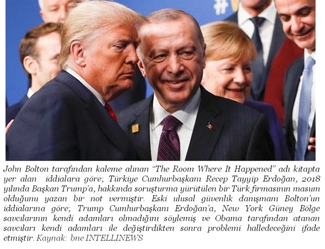 Bay başkanın eski ulusal güvenlik danışmanı Bay Bolton kitabında, Bay Trump’ın 2018 yılında Türkiye Cumhurbaşkanı Recep Tayyip Erdoğan’a, İran yaptırımlarını ihlal etmekle suçlanan bir Türk şirketi hakkında sürmekte olan davaya müdahale etme sözü verdiğini yazmaktadır.