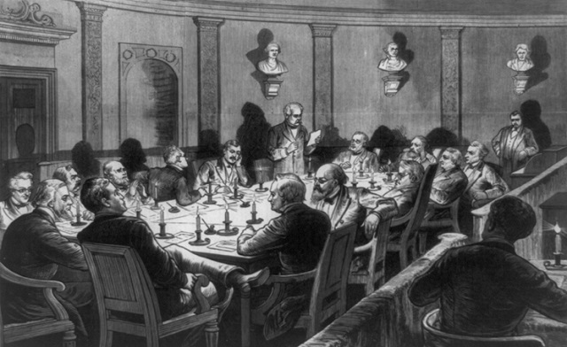 19’uncu yüzyılda birkaç kez adaylardan hiç birinin başkanlığı kazanacak kadar delege elde edemediği seçimler olmuştur. Resimde; Temsilciler Meclisi üyeleri, senatörler ve Yüksek Mahkeme yargıçlarından oluşan Seçici Komisyon, 1876 seçimleri sonrasında tartışmalı Seçici Kurul oyları hakkında görüşürken. 16 Şubat 1877. Komisyon bütün tartışmalı oyların Rutherford B. Hayes lehine olduğuna karar vermiş ve Hayes sadece bir delege oyu farkla başkan seçilmiştir. Kaynak: Leslie’s Illustrated Newspaper via Library of Congress.