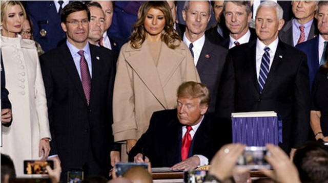 Başkan Donald Trump, Ulusal Savunma Yetkilendirme Yasasının (NDAA-National Defense Authorization Act) kısmı olarak Caesar Suriye Sivil Koruma Yasasını 2019 yılı Aralık ayı içinde imzalamıştır. Yasa kapsamında Suriye ile iş yapan üçüncü taraflar şiddetle cezalandırılacaktır. Foto: Birinci Sınıf Hava Eri Spencer Slocum