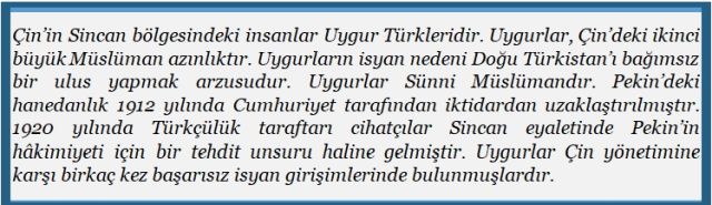 Görünüşte kendi açısından Türk heyetinin yapacağı ziyaretin çerçevesini belirlemeye çalışan Çin’in ‘‘China Daily’’ gazetesinde Erdoğan’ın Çinli liderlere; ‘‘Çin’in Sincan bölgesindeki insanların Çin’in gelişimi ve refahı içinde, mutlu bir