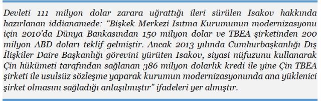 Çin yetkililerinin enerji santralleri inşa ve onarım alanında fazla deneyime sahip olmayan TBEA firmasına Bishkek kentindeki eskiyen santralleri yenilemesi karşılığında 386 milyon ABD doları verilmesi yönündeki ısrarı, eski Kırgız Başbakanı Sapar Isakov’un yolsuzluk suçlamaları nedeniyle hâkim önüne