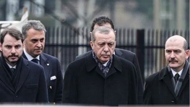Soldan sağa: AKP milletvekili ve Hazine ve Maliye Bakanı Berat Albayrak, ‘‘Türk Tipi’’ Cumhurbaşkanlığı Hükümet Sistemi Türkiye Cumhurbaşkanı ve AKP Milletvekili Recep Tayyip Erdoğan ile AKP Milletvekili ve İçişleri Bakanı Süleyman Soylu.