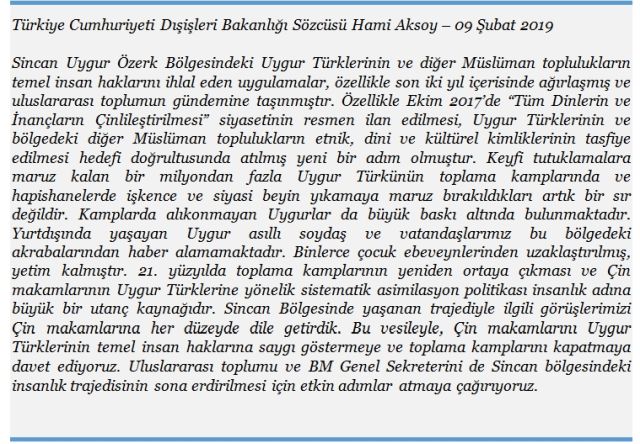 “Çin’in Sincan bölgesindeki insanların Çin’in gelişimi ve refahı içinde, mutlu bir yaşam sürdüğü bir gerçektir. Türkiye, Türk-Çin ilişkilerindeki uyumu kimsenin bozmasına izin vermez. Türkiye aşırılığa kesin bir şekilde karşıdır ve Çin ile karşılıklı siyasi güveni ve güvenlik iş birliğini güçlendirmeyi arzu etmektedir.” Recep Tayyip Erdoğan – Çin Basını
