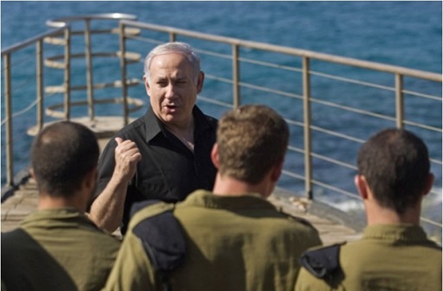 İsrail başbakanı Benjamin Netanyahu, 31 Mayıs 2010 günü yapılan Mavi Marmara saldırısına katılan deniz komandoları ile konuşurken. Atlit Deniz Üssü, 26 Ekim 2010.