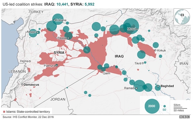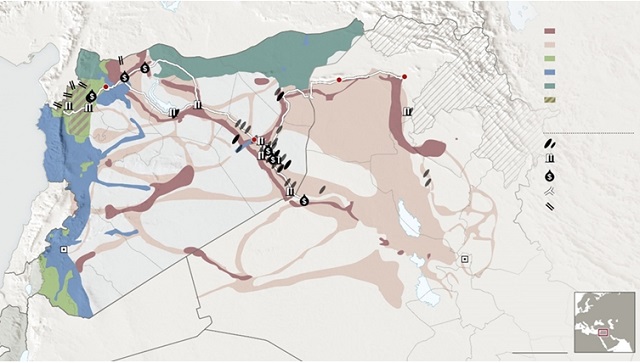 Kırmızı ile gösterilen ve Rusya tarafından desteklenen İran-Irak-Suriye petrol/doğal gaz boru hattının güzergâhı, aşağıda sunulan ve Irak ile Suriye’deki son durumu gösteren harita ile karşılaştırıldığında, bu hattın geçtiği yerlerde kontrolün İslami Devlet terör örgütünün kontrolünde olduğu görülmektedir. Koalisyon güçleri tarafından yapılan hava saldırılarının yoğunlaştığı bölgeler de petrol boru hattı ile birebir çakışmaktadır.
