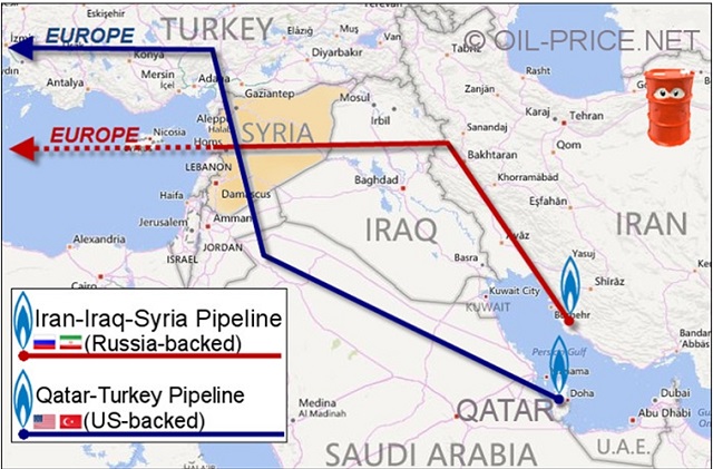 Suriye’deki iç savaşın nedeni; yukarıdaki haritada görülen iki boru hattının inşasıdır. Kırmızı ile gösterilen hat, Rusya tarafından desteklenen ve İran petrolünün, Irak ve Suriye üzerinden Humus liman kentine, oradan da Avrupa’ya taşınmasını öngören İran-Irak-Suriye güzergâhıdır.