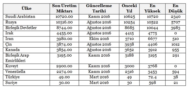 2016 yılı rakamlarına göre dünyanın en fazla petrol üreten ilk on ülkesi aşağıdaki tabloda sunulmuştur. Bu ülkelerden Suudi Arabistan, Irak, İran, Birleşik Arap Emirlikleri, Venezüella ve Kuveyt OPEC üyesidirler. Türkiye 2015 yılı rakamlarına göre günlük 61.000 varil üretimiyle 53’üncü, Suriye ise günlük 33.000 varil üretimiyle 60’ıncı sıradadır. Bu rakamlara bakıldığında, Suriye kesinlikle petrol zengini bir ülke değildir.