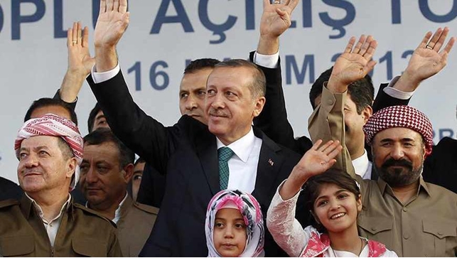 Irak Kürdistanı Lideri Massoud Barzani, Türkiye Başbakanı Recep Tayyip Erdoğan ve 1970’li yıllarda Türkiye’den kaçan Kürt şair ve şarkıcı Sivan Perwer, Diyarbakır’da düzenlenen bir törende halkı selamlarken, 16 Kasım 2013. Kaynak: REUTERS