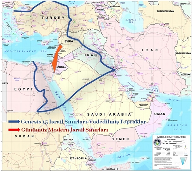 Tevrat ve Zebur olarak adlandırılan Eski Ahit’e göre Yahudiler, Arz-ı Mev’ud kavramına inanmaktadır. Vaat Edilmiş Topraklar anlamına gelen bu kavrama göre Mısır’ın Nil nehri ile Türkiye’nin Fırat nehri arasında kalan topraklar inanışa göre Yahudilere aittir. Siyonist Yahudiler ve onların bir eseri olan İsrail Devleti, inanış gereği bu toprakların peşinde.
