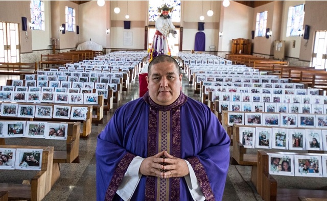 Costa Rica’nın San José kentindeki ‘‘Our Lady of Fatima’’ kilisesi rahibi Victor Jimenez COVID-19 salgını nedeniyle kiliseye gelemeyen cemaatin fotoğraflarını kilise sıralarına yerleştirerek, cemaatin kutsal hafta boyunca temsili olarak dua etmelerini sağlamıştır. Foto: Ezequiel Becerra/AFP/Getty Images