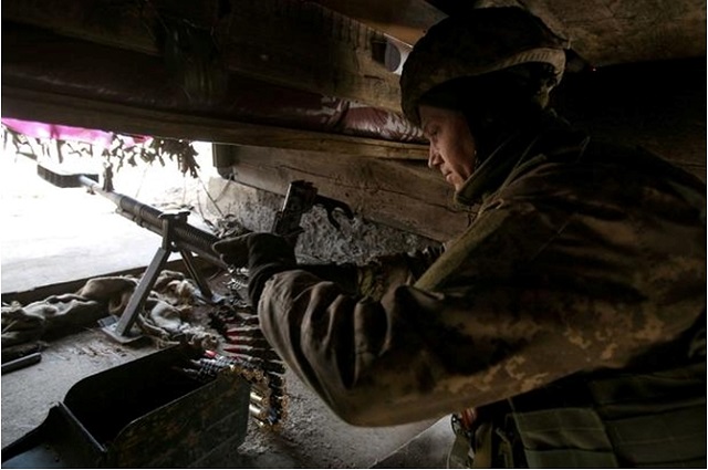 Ukraynalı bir asker, Donetsk bölgesinde, Rusya destekli ayrılıkçı cephesinde mevzide nöbet tutarken görülmektedir. 19.02.2021. Kaynak: Anatolii Stepanov/AFP/GETTY.