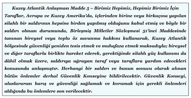 NATO Anlaşmasının ünlü beşinci maddesi ‘‘Birimiz hepimiz, hepimiz birimiz için’’ maddesi olarak da bilinmektedir ve NATO organizasyonunun temel taşıdır. Madde 5, üye ülkelerden birine yapılan saldırının bütün üyelere yapıldığı anlamına geldiğini ifade eder ve kolektif bir savunma olasılığını harekete geçirir. Bu madde günümüze kadar; kara, deniz, have ve son zamanlarda eklenen siber ortam gibi sadece daha geleneksel askeri saldırılara karşı uygulanmıştır.