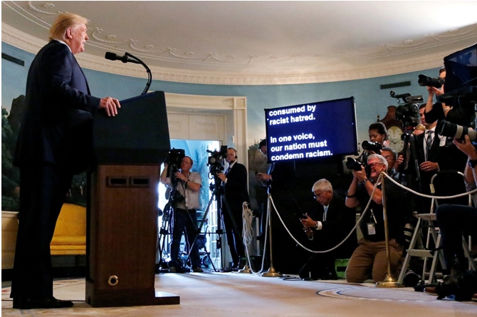 Eski ABD Başkanı Donald Trump Beyaz Ev’de El Paso ve Dayton silahlı saldırıları hakkında konuşurken, 05 Ağustos 2019. Fotoğraf: Leah Millis/Reuters