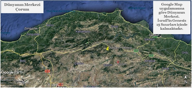 Fizikçi Andrew J. Woods, dünyanın coğrafik merkezinin, İsrail’in Genesis 15 sınırları içinde bulunan, Türkiye’nin başkenti Ankara yakınlarında bir yerde olduğunu ilan etmiştir. Google Maps uygulaması da yine İsrail’in Genesis 15 sınırları içinde bulunan Türkiye’nin Çorum kentini, dünyanın coğrafik merkezi olarak işaretlemiştir. Bu iki yer birbirinden 149 mil uzaklıktadır. 1864 yılında gök bilimci Charles Smyth ise dünyanın merkezinin Mısır’da bulunan Büyük Giza (Keops) Piramidi olduğunu belirlemiştir.
