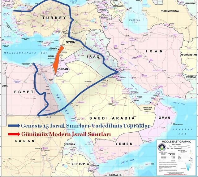 Ortada; kutsal kitapta geçen, Tanrı ile Abraham arasında yapılan bir anlaşma var, bu anlaşmaya göre Genesis 15 İsrail Sınırları yazının başında sunulan haritada görülmektedir. Bir de Kanlı Oded Yinon Planında Dünya Siyonist Organizasyonunun Yahudi Devleti için öykündüğü yukarıdaki harita var.