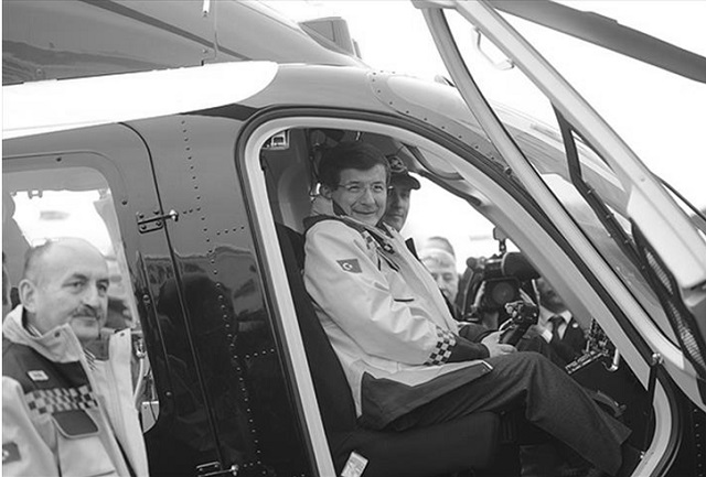 Gece uçuş kapasitesine sahip ambulans helikopterin Başbakan Davutoğlu’nun da katıldığı törenle görevine başladığını anlatan ‘‘Gece uçabilen ambulans helikopter görevde’’ başlıklı, 18 Ocak 2015 tarihli AA haberinden alıntıdır. Fotoğrafta kameralara gururla poz veren Başbakan Ahmet Davutoğlu ve Sağlık Bakanı Mehmet Müezzinoğlu görülmektedir. Kaynak: AA