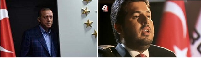 Solda Türkiye Cumhuriyeti Cumhurbaşkanı ve AKP Lideri Recep Tayyip Erdoğan, sağda ise ‘‘BABAMIN OĞLU DEĞİL’’ dediği Reza Zarrab.