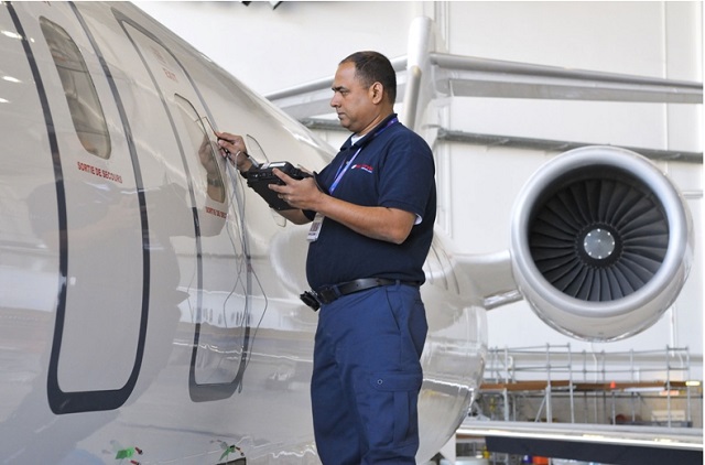 Durumlu bir parçaya Tahribatsız Muayene (NDI) uygulayan bir bakım personeli. Kaynak: SKYSERVICE