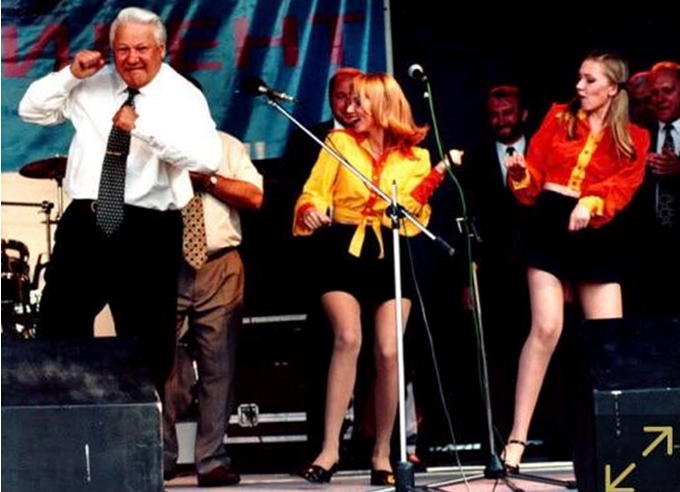 Amerikalı danışmanların tavsiyesiyle gençlerle bir festivale katılan, ancak abartan Yeltsin, sahnede çılgınca dans ederken.