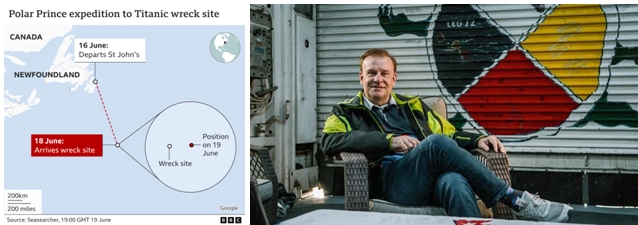 Solda Titanic enkazı, sağda ise İngiliz milyarder Hamish Harding’in dalış öncesi Facebook paylaşımı. Kaynaklar: BBC ve FACEBOOK.
