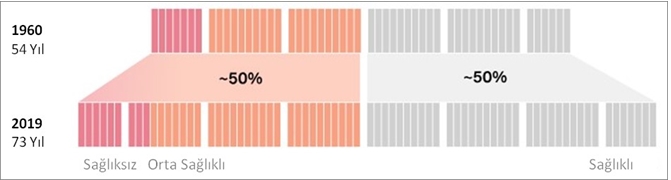 Son 60 yılda (1960-2019), yukarıdaki grafikte de görüldüğü gibi, dünya genelinde ortalama yaşam beklentisinde büyük bir artış görülmüş, ancak sağlıksız veya orta sağlıklı geçirilen yaşam oranı, aşağıdaki grafikte görüldüğü gibi aynı kalmıştır.